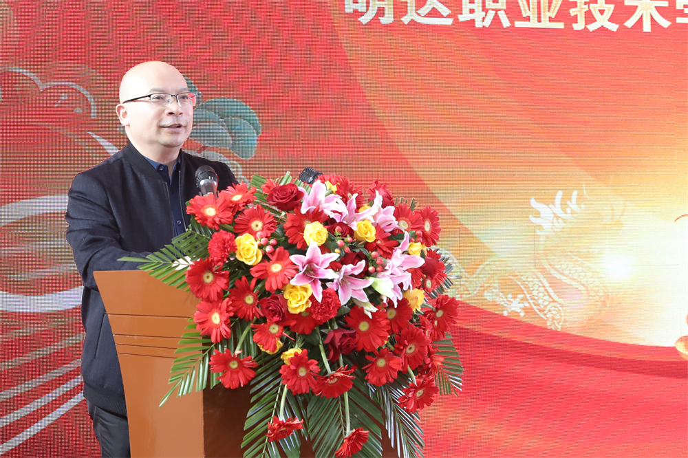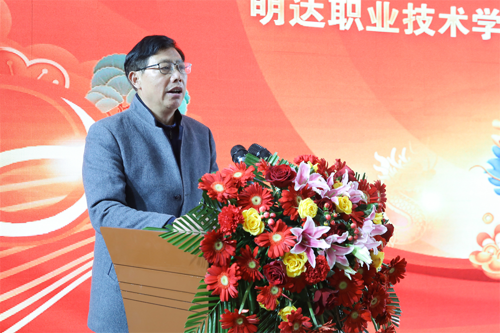 蒋德勤致辞。他回顾了2023年,在平凡中留下了奋发进取的足迹。牢记立德树人根本任务,凝心聚力、砥砺前行,办学规模、专业建设和人才队伍建设取得多年来的历史性突破,办学条件逐步改善,校园重新焕发生机和活力。他代表学校领导班子,向为学校事业发展作出贡献的教职员工表示衷心的感谢和崇高的敬意!